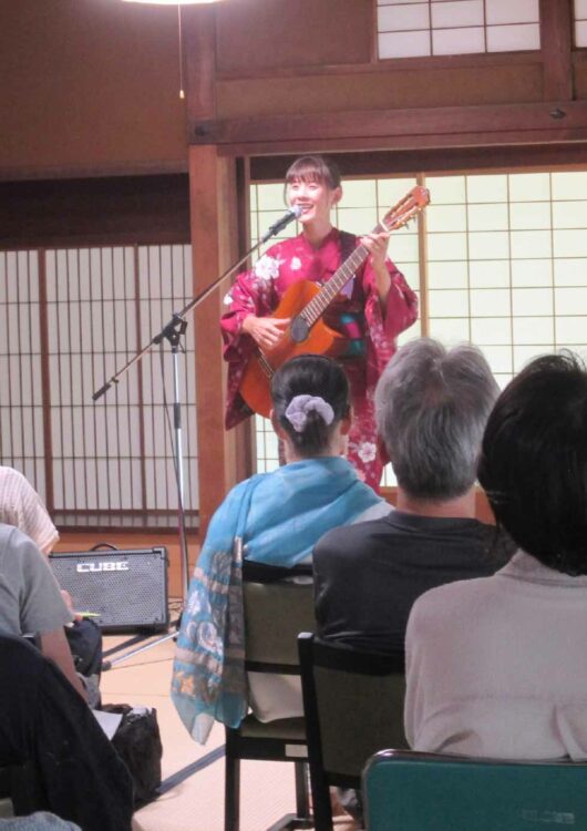 伝統的な建物の創垂館で、アコースティックギターのコンサートを楽しみます。